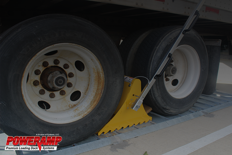 Once a trailer is fully backed and parked in position against the dock bumpers, the UXL is taken from the stored position and placed under the front of one of the trailer’s back tires on the track. This will display a message on the iDock Controller that the unit is in a safe position. The dock attendant can then proceed to open the door and deploy the leveler.